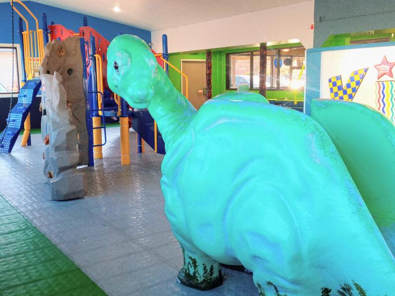 KID POWER is a 2,000 sq. ft. room with full sized play structure, Dino the Dinosaur for our younger children, video games for the older children, and an air hockey table for children of all ages! Large windows allow parents to watch the children as they play from the back dining room. This is the perfect area for Birthday Parties!